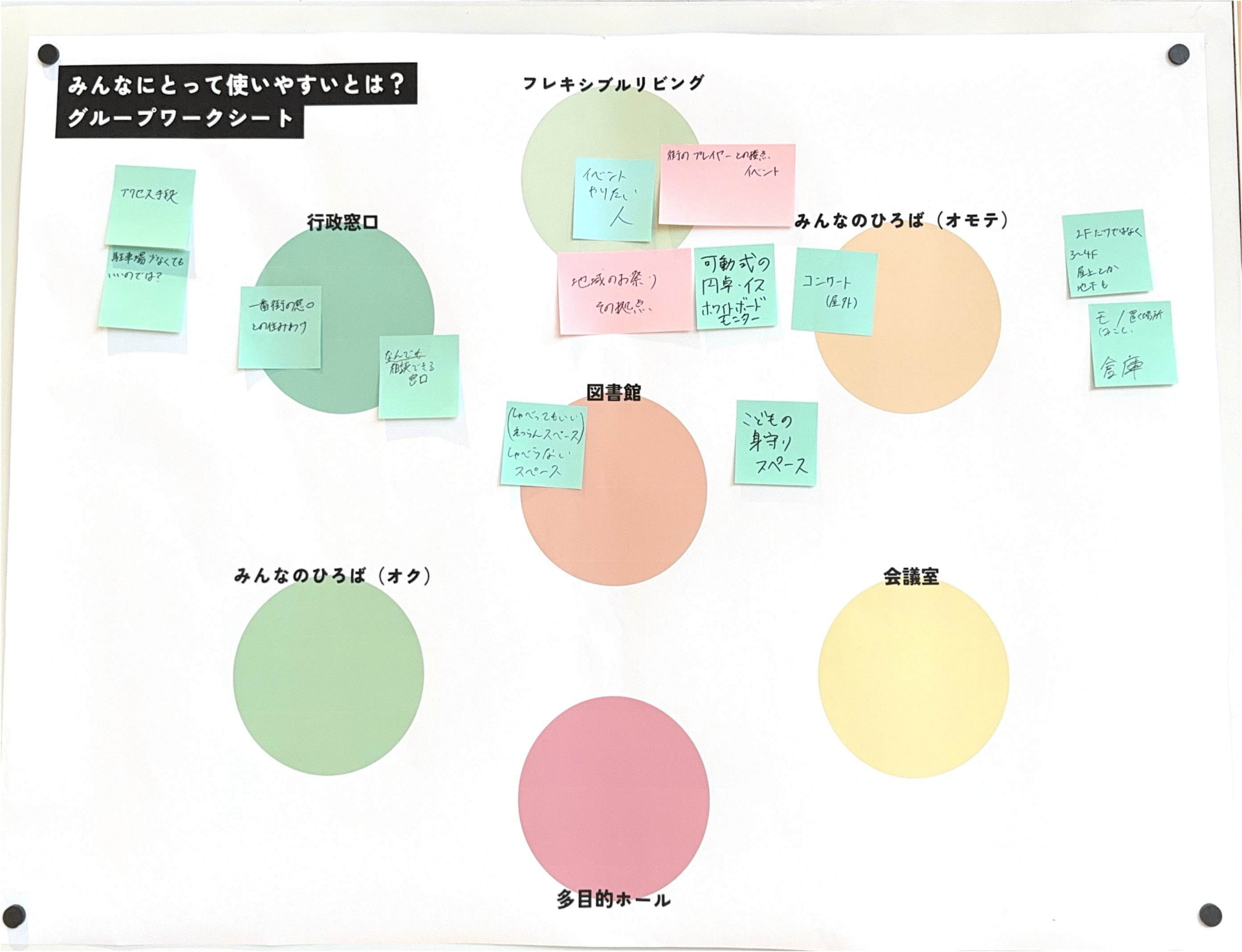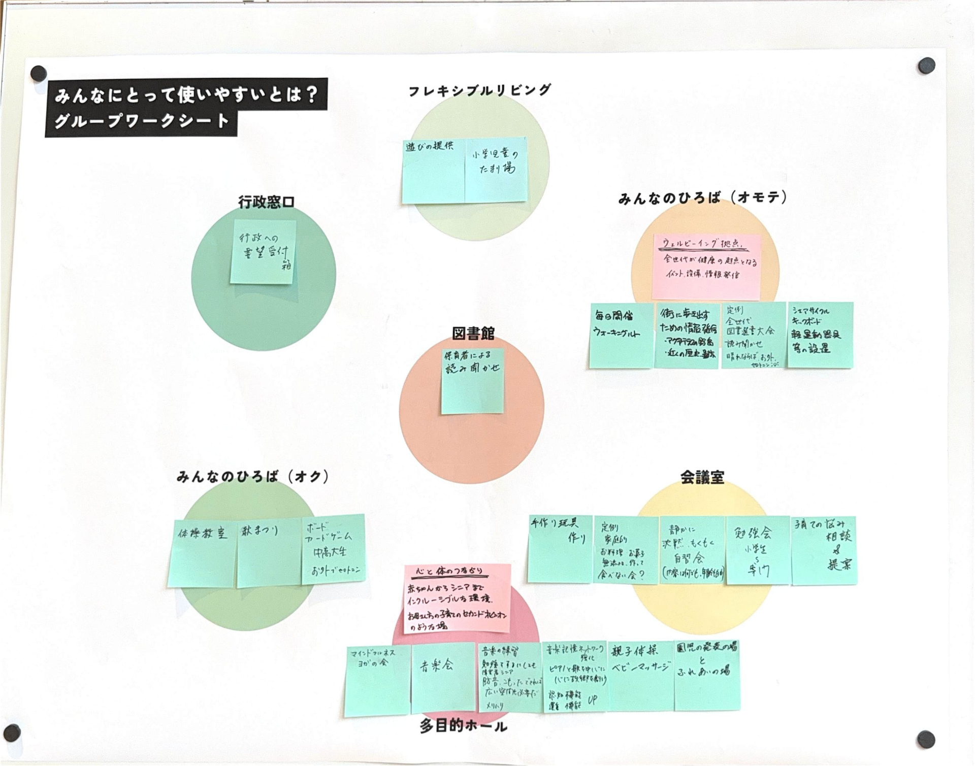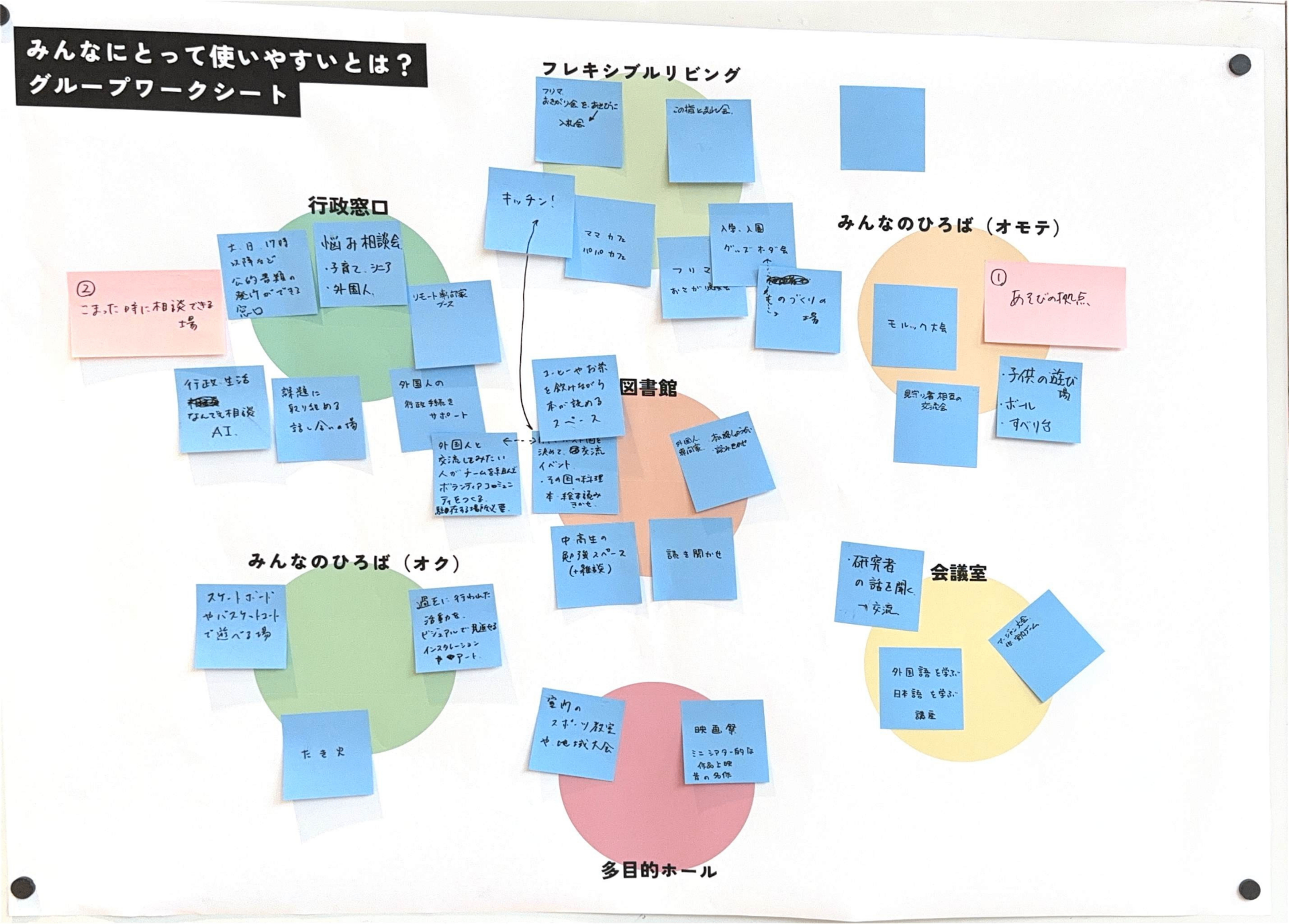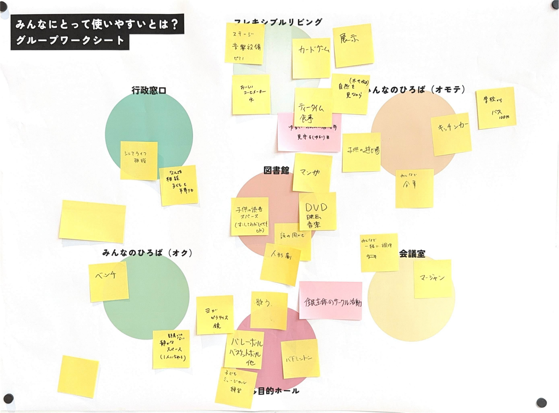 あたらしい近隣センターに求められている「役割」とそれを実現するために「生まれてほしい活動」をグループで話し合ってもらいました。たくさん活動がある中で、限られたスペースと時間をどう分け合っていくかを考えてもらいました。
