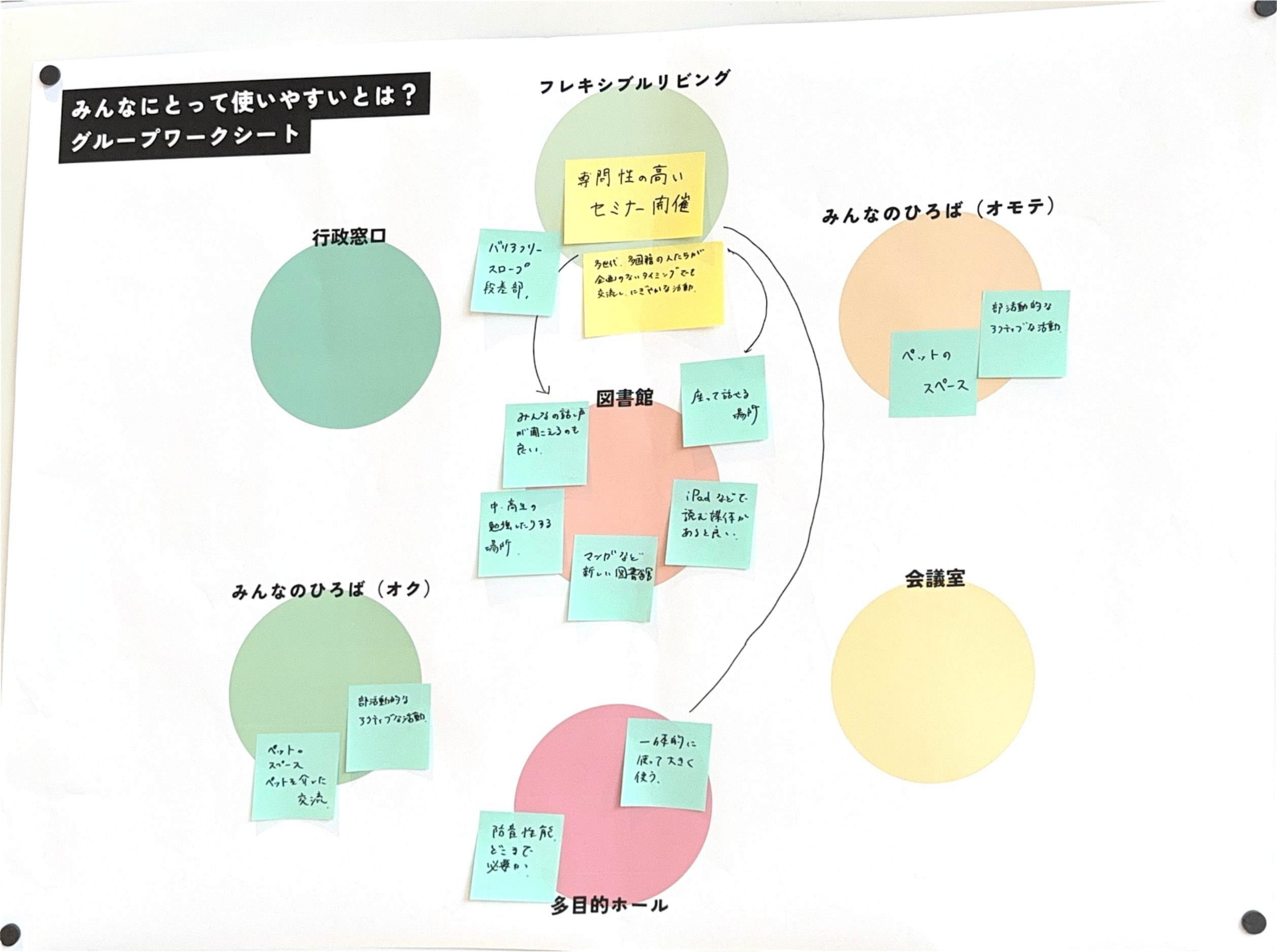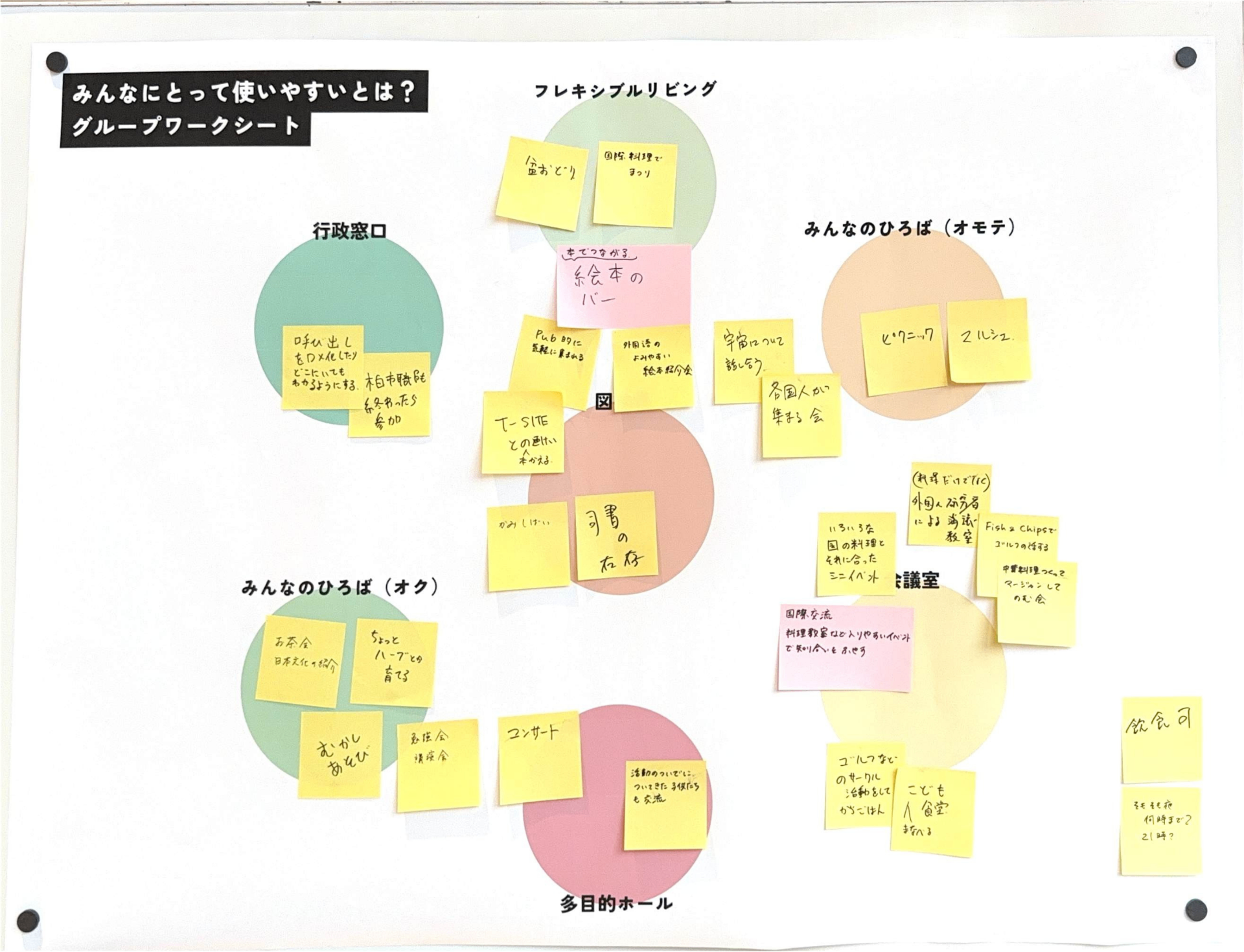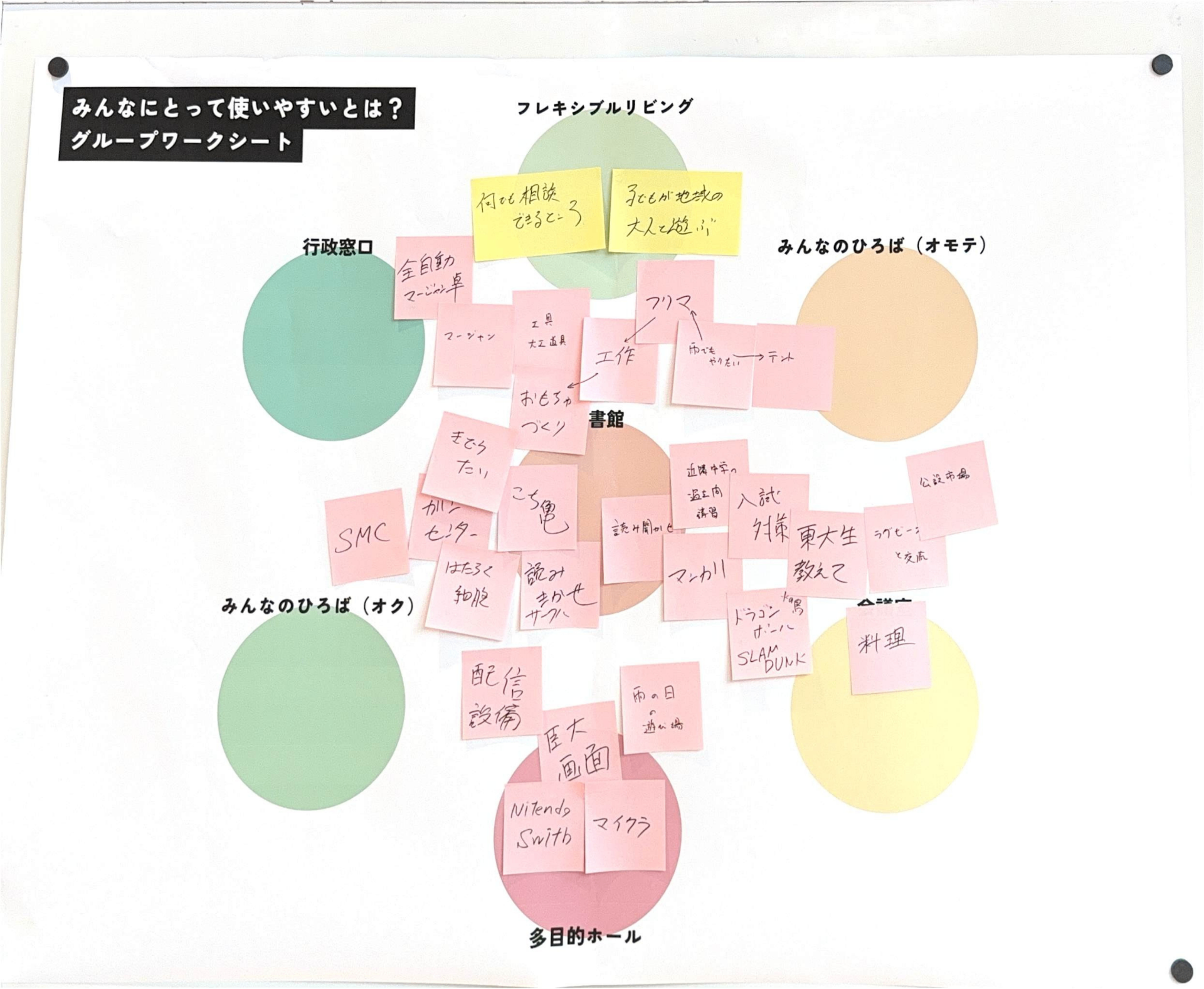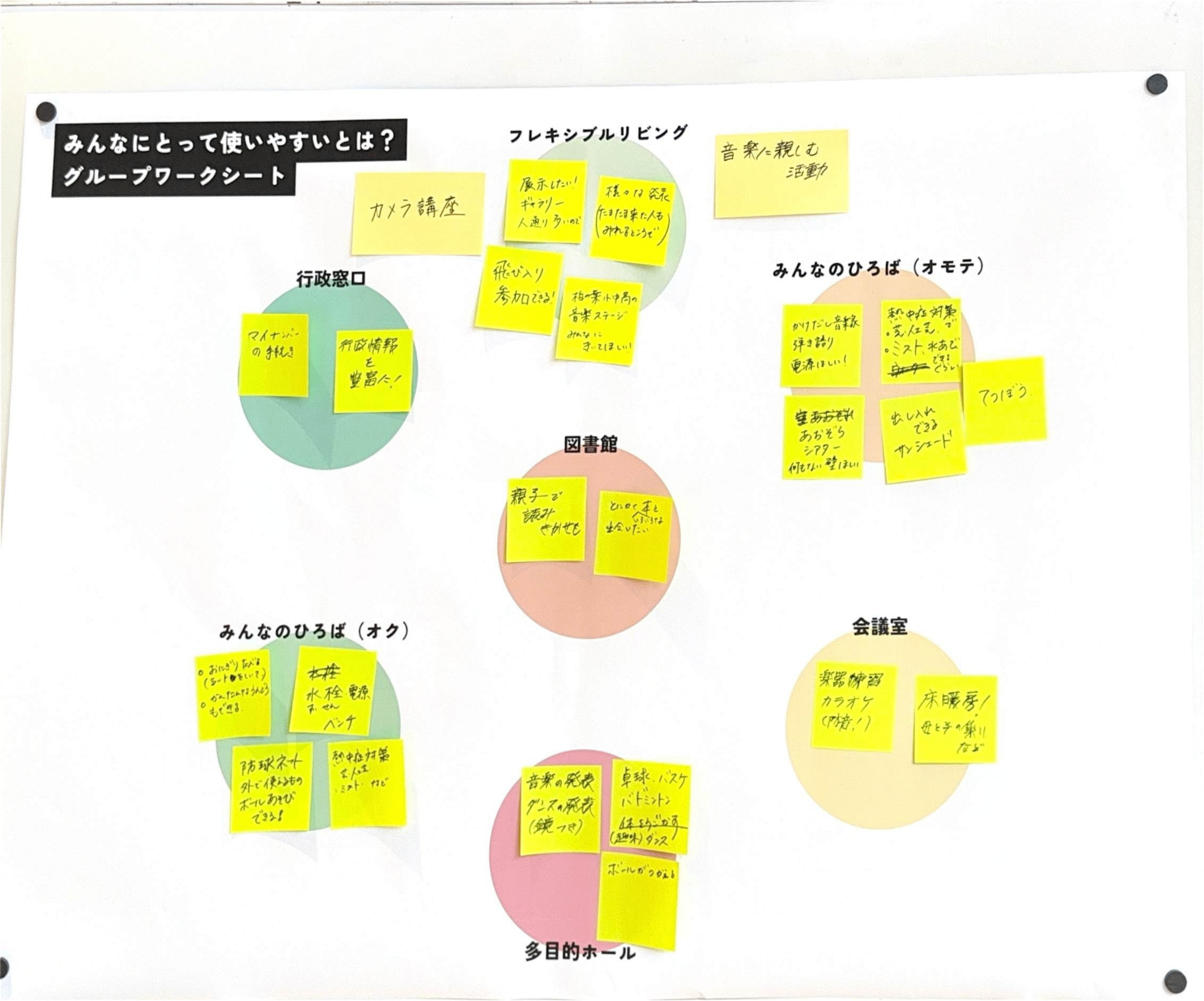 あたらしい近隣センターに求められている「役割」とそれを実現するために「生まれてほしい活動」をグループで話し合ってもらいました。たくさん活動がある中で、限られたスペースと時間をどう分け合っていくかを考えてもらいました。