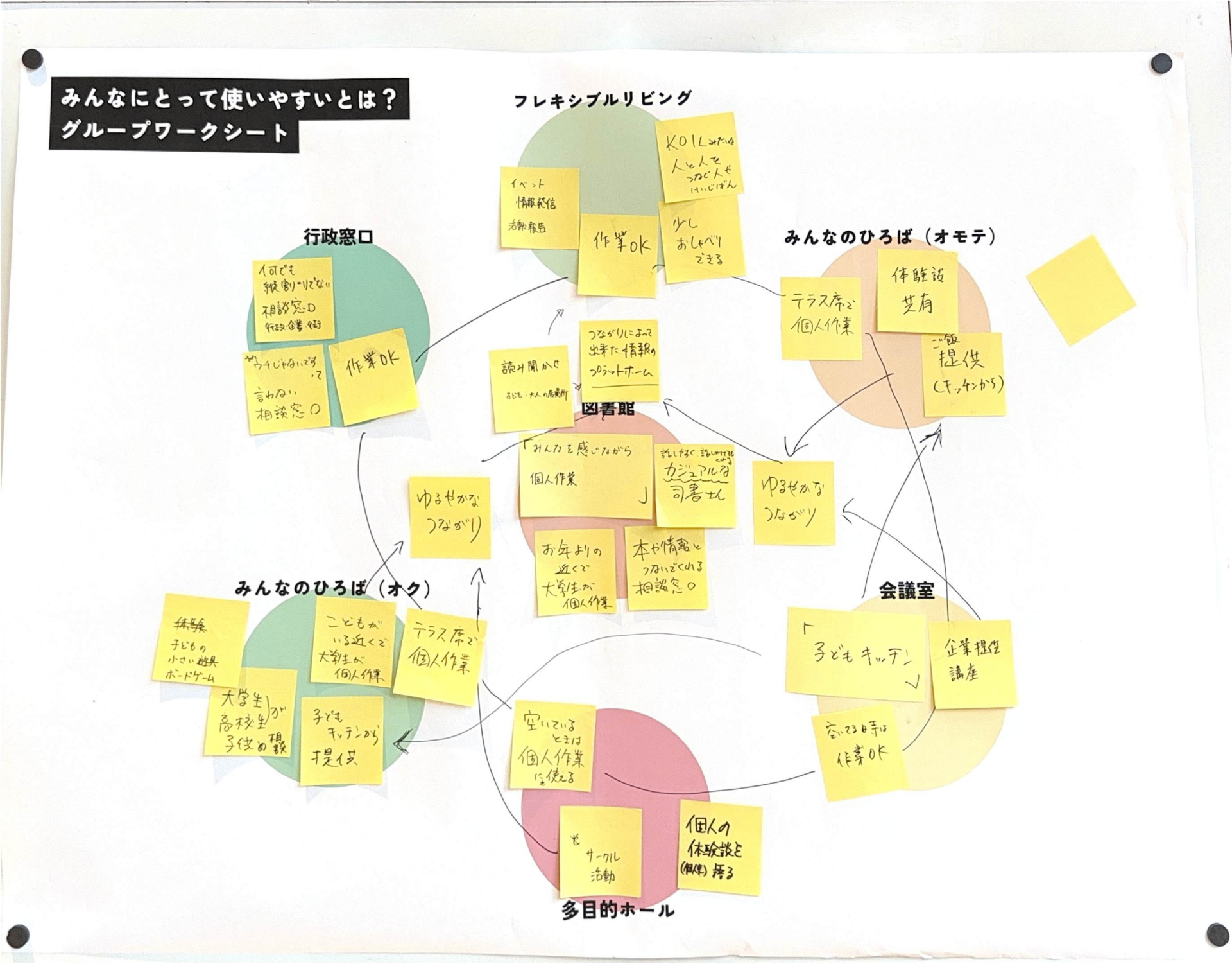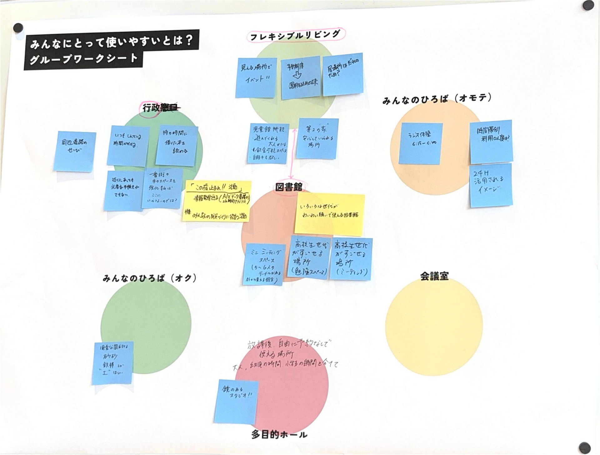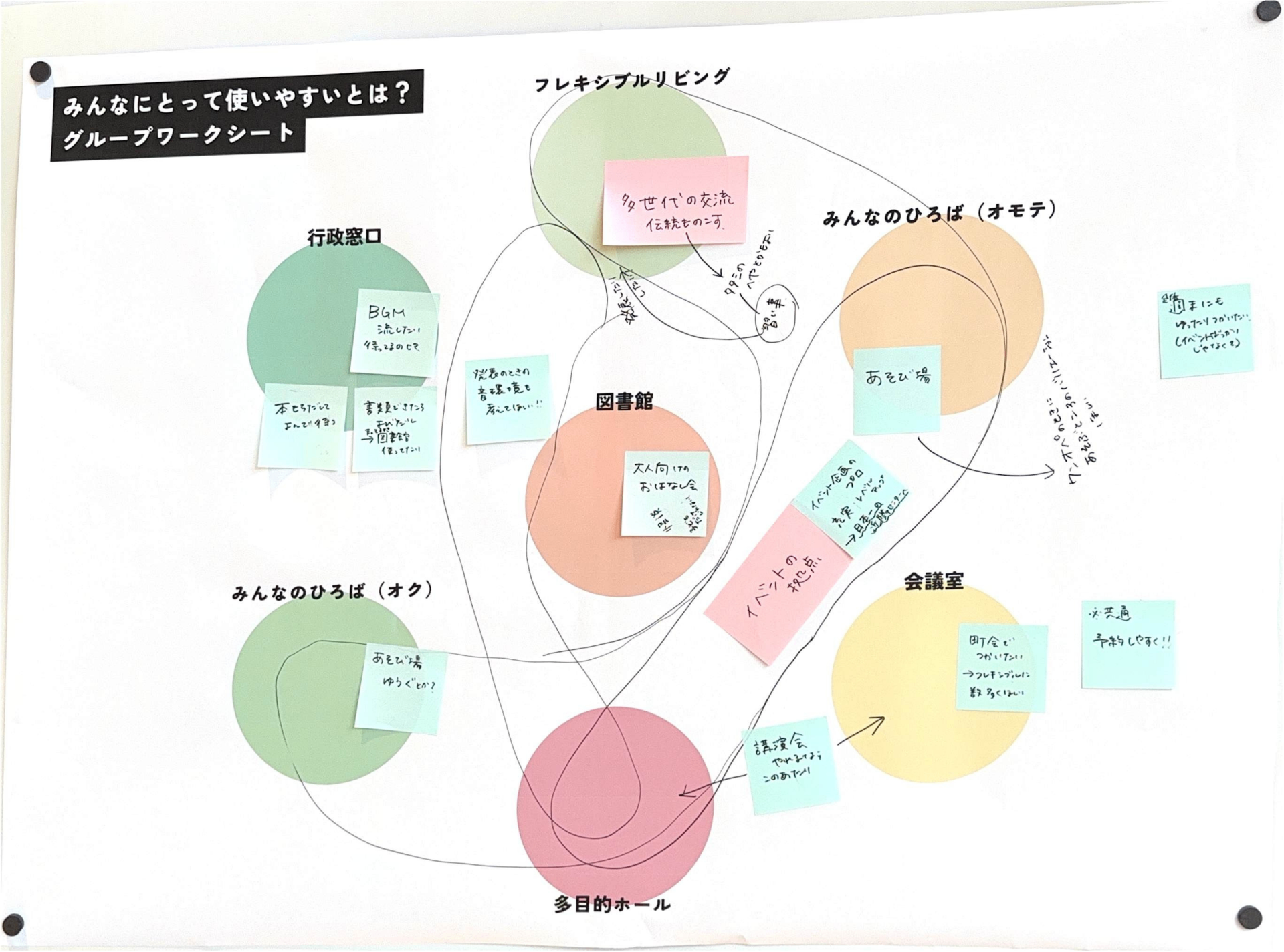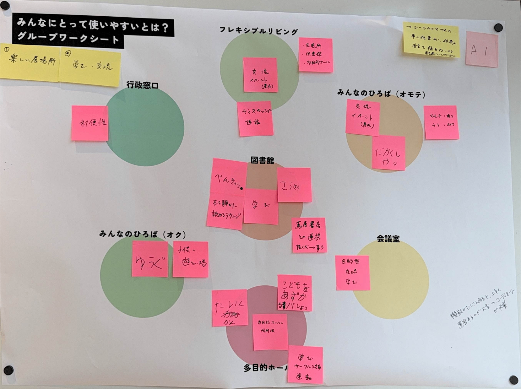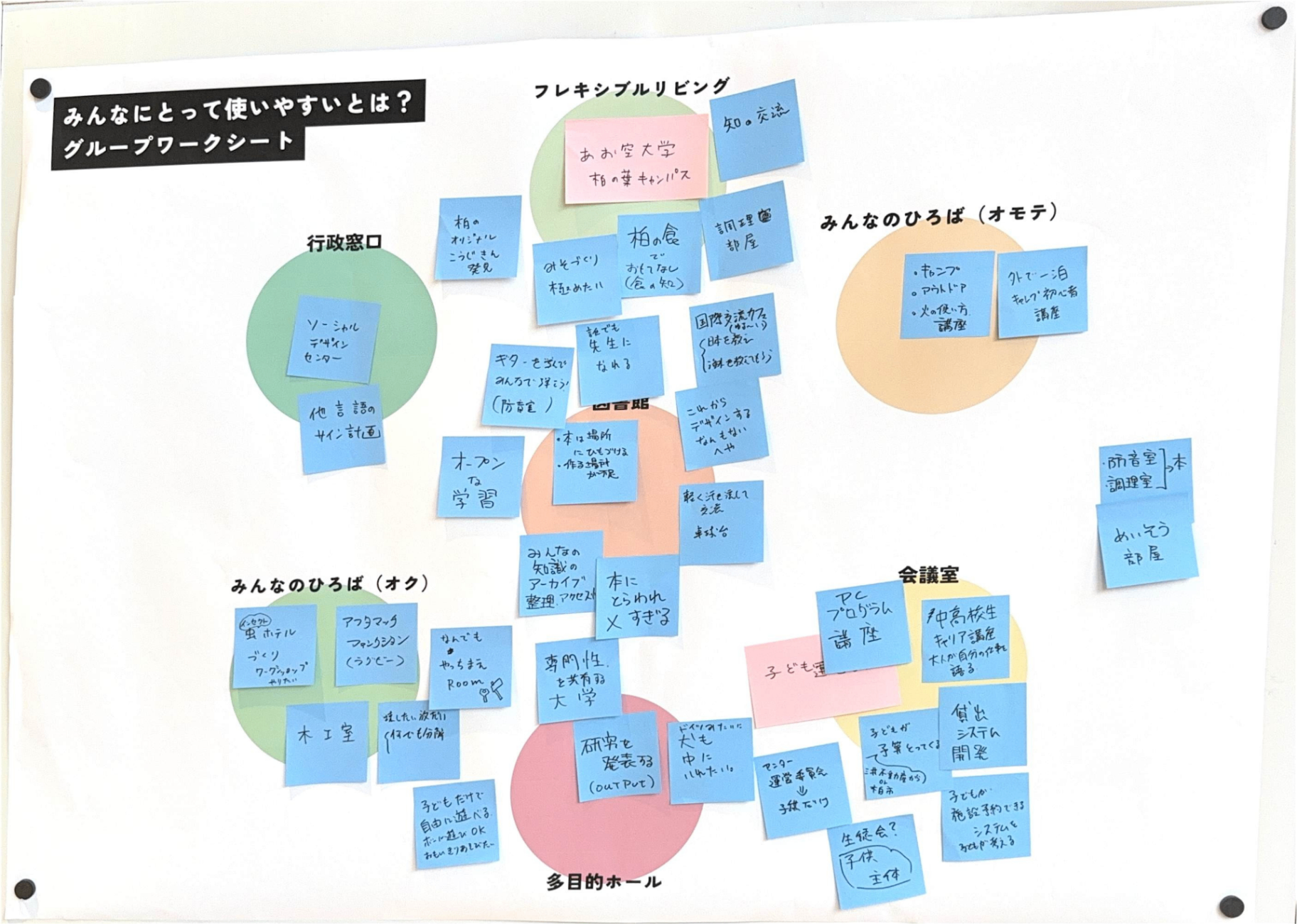あたらしい近隣センターに求められている「役割」とそれを実現するために「生まれてほしい活動」をグループで話し合ってもらいました。たくさん活動がある中で、限られたスペースと時間をどう分け合っていくかを考えてもらいました。