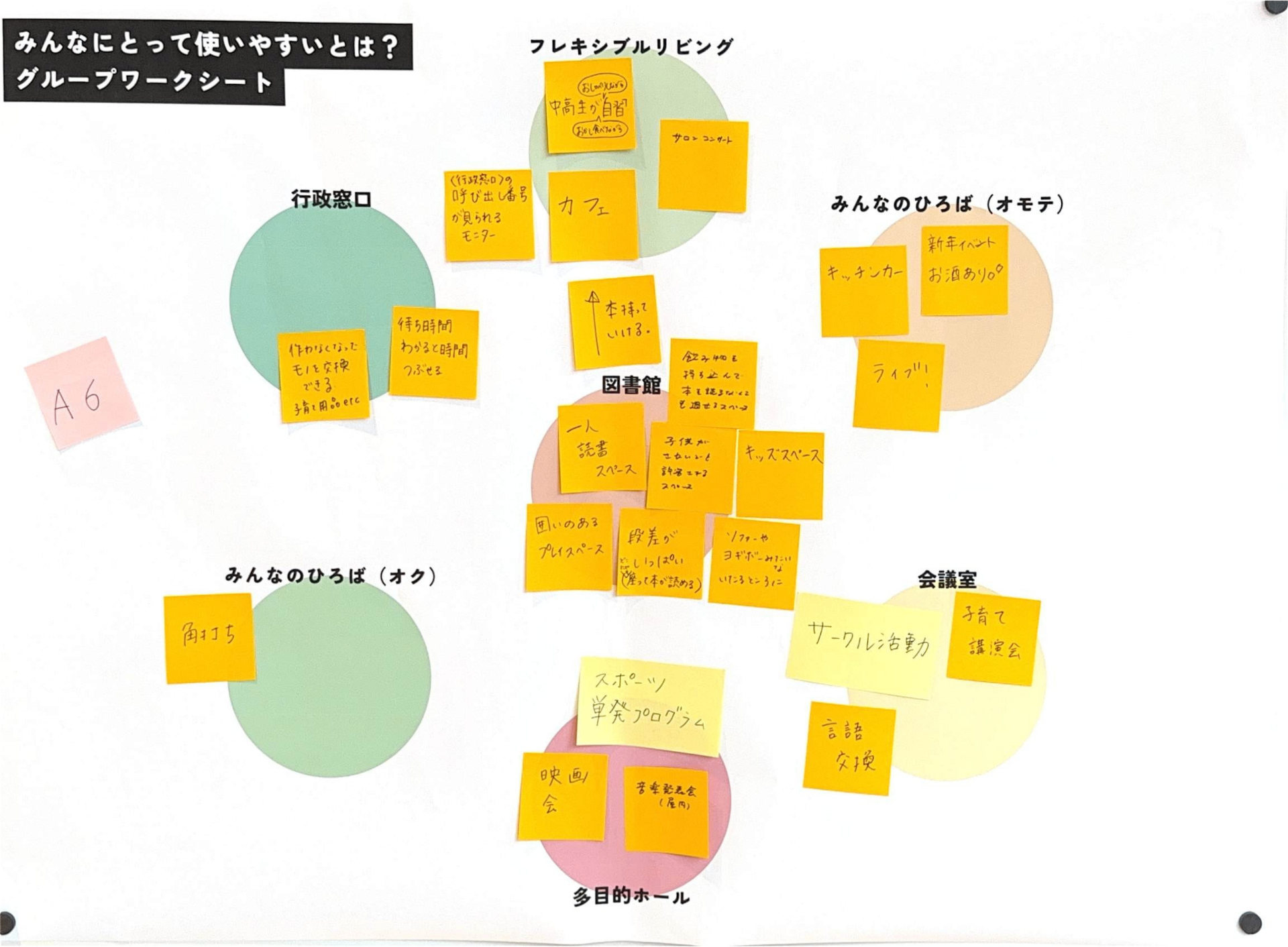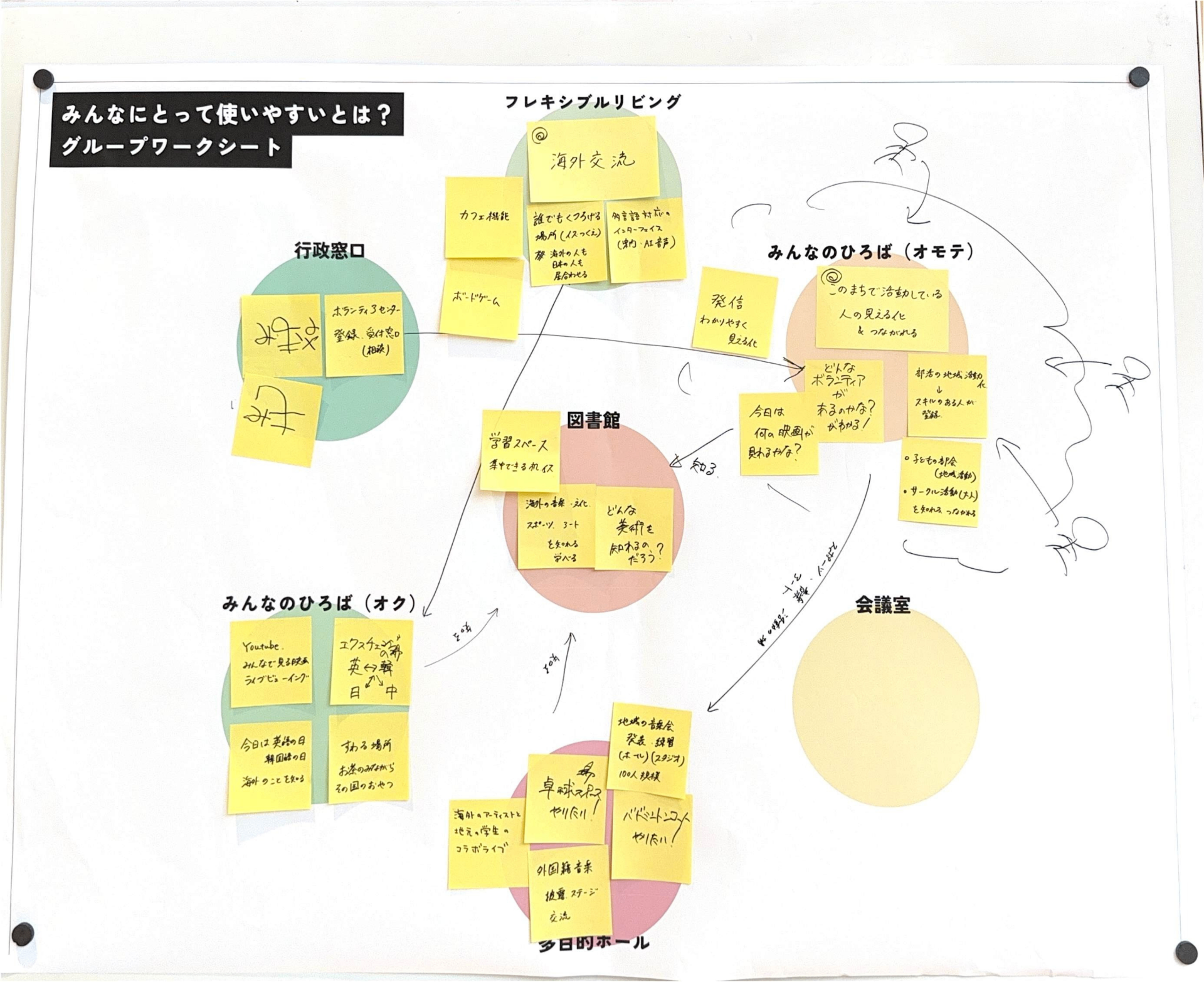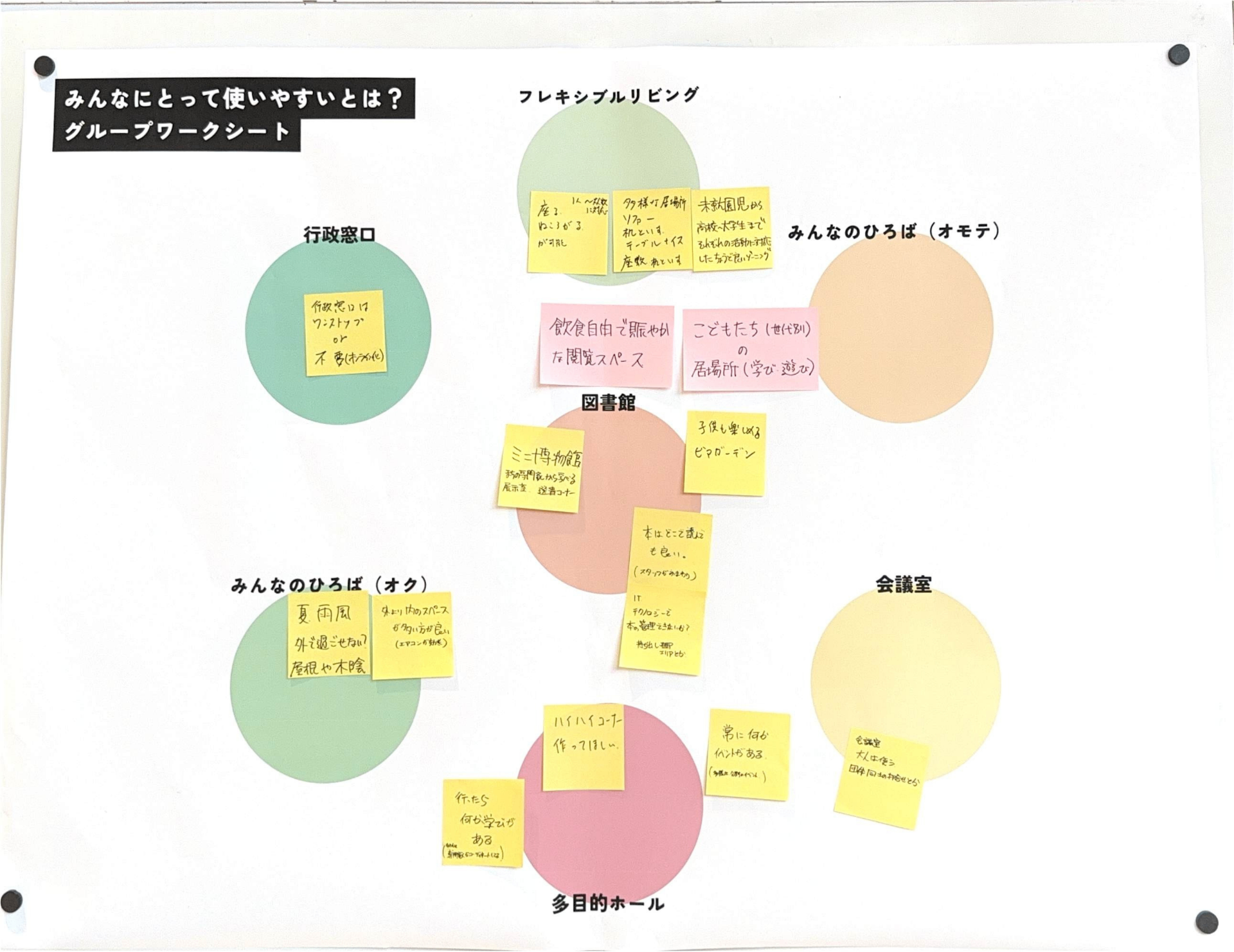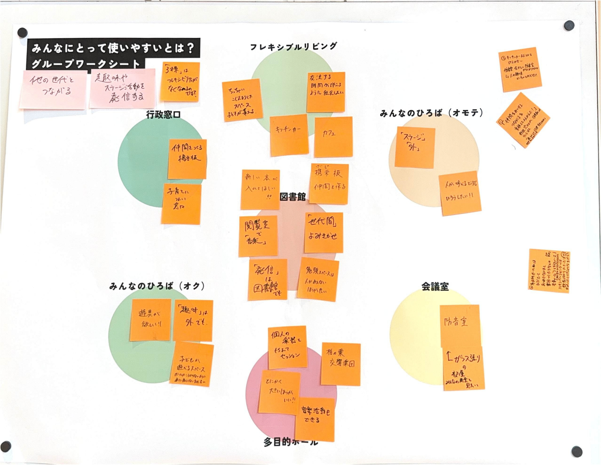 あたらしい近隣センターに求められている「役割」とそれを実現するために「生まれてほしい活動」をグループで話し合ってもらいました。たくさん活動がある中で、限られたスペースと時間をどう分け合っていくかを考えてもらいました。